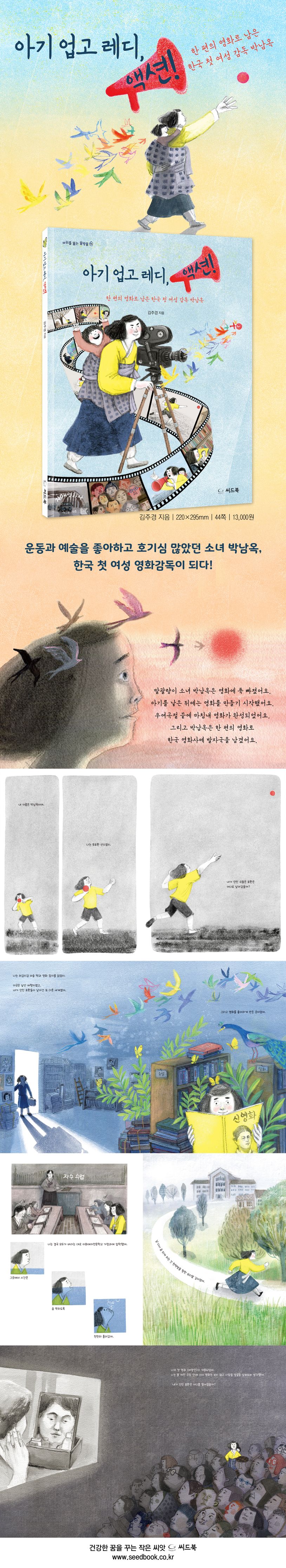 『아기 업고 레디, 액션!』은 투포환을 소재로 활용하여 한국 첫 여성 감독인 박남옥의 꿈과 인생 전반이 촘촘하게 이어지도록 구성한 책입니다. 박남옥은 꿈을 담아 포환을 여러 번 던졌어요. 투포환 선수가 되기 위한 꿈, 미술을 공부하기 위한 꿈, 그림책을 만들고 싶은 꿈, 그리고 영화감독을 맡고 싶은 꿈 등 박남옥은 꿈을 담아 온몸으로 포환을 던졌어요. 하고 싶은 일이 많았던 만큼 도전도 많이 했어요. 힘든 순간도 있었지만 신났어요. 특히 영화를 만드는 일은 설렜어요. 영화는 아기를 업고 일하게 될 만큼 매력적이었지요. 온갖 시련과 우여곡절 끝에 박남옥은 영화를 완성했어요. 영화는 단 한 편만 남았지만 박남옥 이후로 개성 있는 여자 감독들이 뒤를 이어 등장했어요. 여자도 뭐든지 할 수 있다는 자신감을 얻게 되었지요.