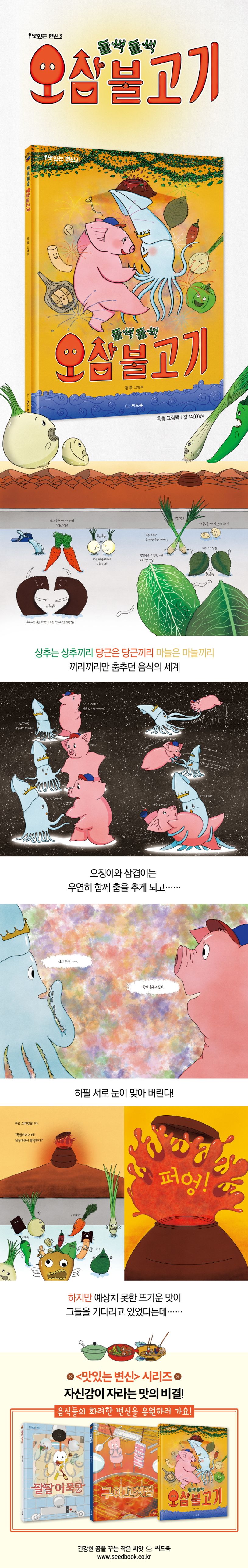 맛없는 어묵과 덜 익은 닭가슴살 꼬치를 화려하게 변신시켰던 〈맛있는 변신〉 시리즈의 마지막 『들썩들썩 오삼불고기』는 오징어, 돼지, 양파, 마늘 등 우리가 흔히 알던 먹거리들이 춤을 추는 이야기예요. 음식들이 어떻게 춤을 추냐고요? 김은 너풀너풀 온몸을 가볍게 움직이고 양파는 눈물이 날 정도로 아름다운 춤을 추지요. 철판 무도회장 위에서라면 누구든 멋진 춤을 출 수 있거든요!