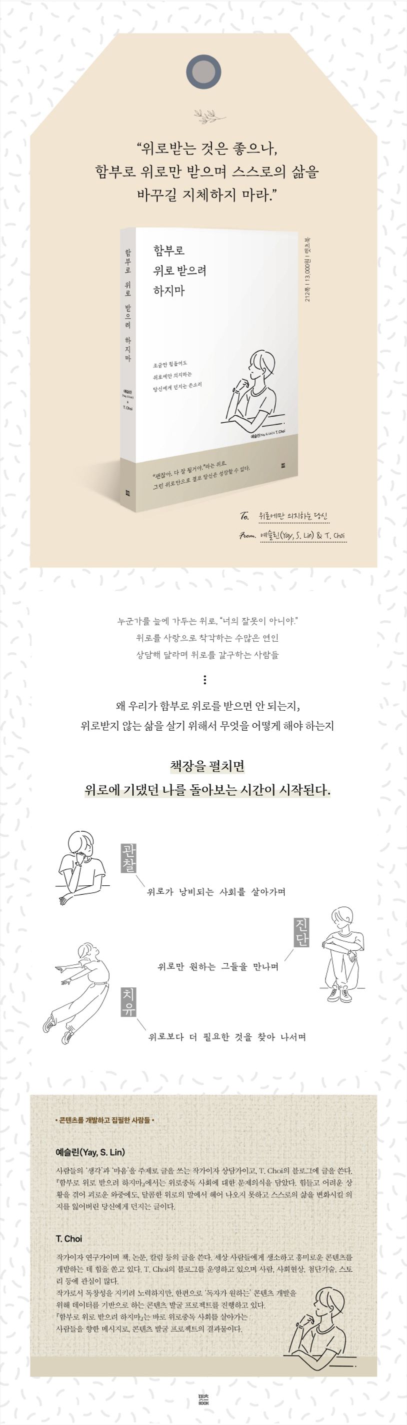 우리의 일상 곳곳에서는 크고 작은 ‘텅 빈 위로’들이 수다처럼 오간다. 텅 빈 위로는 하는 사람에게도 이를 받는 사람에게도 남는 것이 없는 비효율적인 행위다. 이 에세이는 그런 행위에 대한 깊은 고찰과 함께 복잡한 마음, 쉽지 않은 상황으로 널브러져 있는 마음을 다잡는 이야기, 더 나아지고자 하는 고민에 홀로 몰입하며 길을 찾을 수 있는 영감과 팁 등 자신을 찾아가는 법을 독자들에게 전한다.