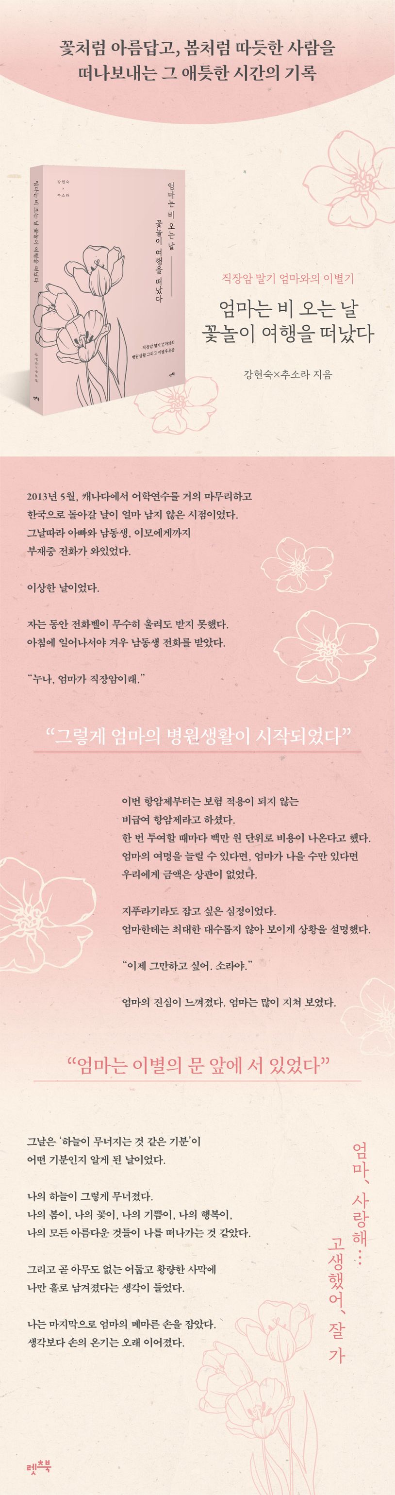 『엄마는 비 오는 날 꽃놀이 여행을 떠났다』는 직장암 말기 엄마와 그 가족의 마지막 시간을 담은 에세이다. 저자의 엄마는 2013년 첫 암 선고를 받은 이후, 5년의 완치 판정을 앞둔 4년 차에 재발 선고를 받는다. 온갖 매체에서 ‘암 완치’ 이야기가 넘쳤기에, 어쩌면 당연히 나으리라 생각했지만 점점 병원에서 병실로, 병실에서 병상으로 좁혀지는 엄마의 공간을 보며 어느새 기적을 바랐다는 것을 알게 된다. 이별이 성큼성큼 다가오고 있음을 알아챘을 때, 온 가족은 엄마의 마지막 시간이 행복으로만 채워질 수 있도록 마음을 모은다….