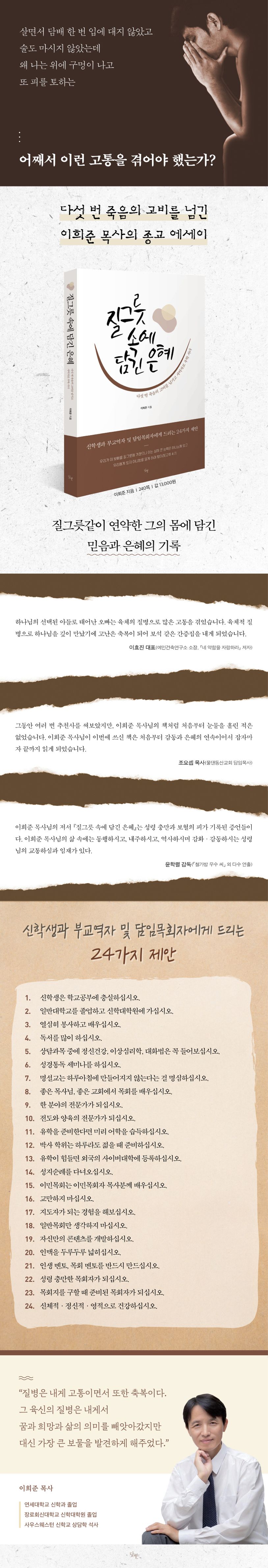 이희준 목사에게도 가시가 있었다. 간경화, 그는 살면서 다섯 번 피를 토했다. 그 역시 사도 바울처럼 하나님께 가시를 빼달라고 기도했다. 하지만 하나님은 마찬가지로 그의 가시를 빼주지 않았다. 그는 이런 시련을 주신 하나님을 원망했다. 하지만 다섯 번 죽음의 고비 끝에 하나님의 『질그릇 속에 담긴 은혜』를 깨달았다. 그때부터 그의 가시는 고난이 아닌 하나님이 주신 ‘은혜’가 되었다.