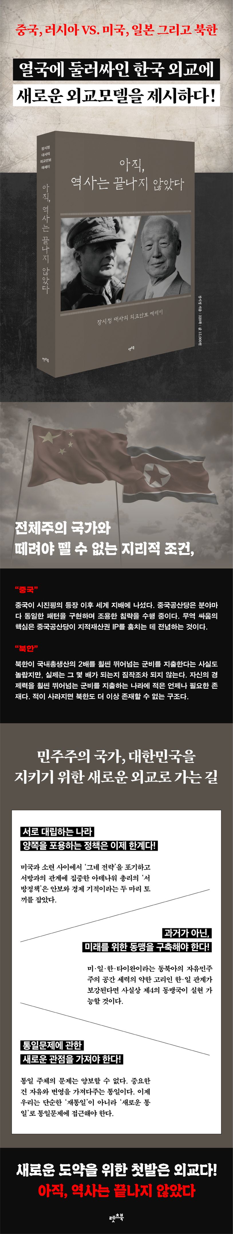 『아직, 역사는 끝나지 않았다』에서는 외교적 사건들을 훑으며, 각각으로 치부되던 사건이 어떤 외교의 의미와 흐름을 나타내고 있었는지를 깊이 있게 볼 수 있다. 또한 장시정 대사가 말하는 외교모델의 근거를 확인하며, 한국 역사를 이어갈 ‘새로운 외교’를 기대하게 한다.