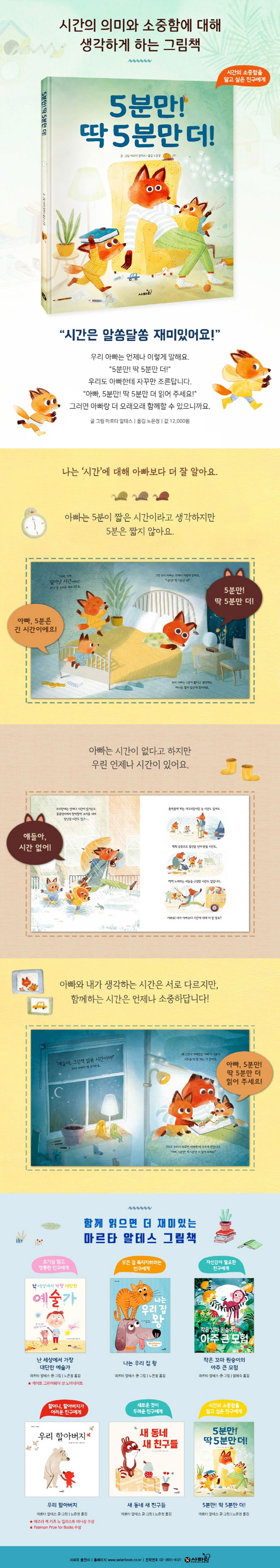시간은 누구에게나 평등하게 주어집니다. 그러나 그 시간들을 모두 다르게 보내지요. 같은 ‘5분’을 아빠와 아이가 서로 다르게 받아들이며 보내는 것처럼요. 좀 더 자고 싶어서 ‘5분만 더!’를 외치는 아빠와 아빠랑 좀 더 오래 함께 있고 싶어서 ‘5분만 더!’ 하고 조르는 아이를 보며 함께하는 시간의 소중함과 감사함에 대해 생각해 보게 됩니다.