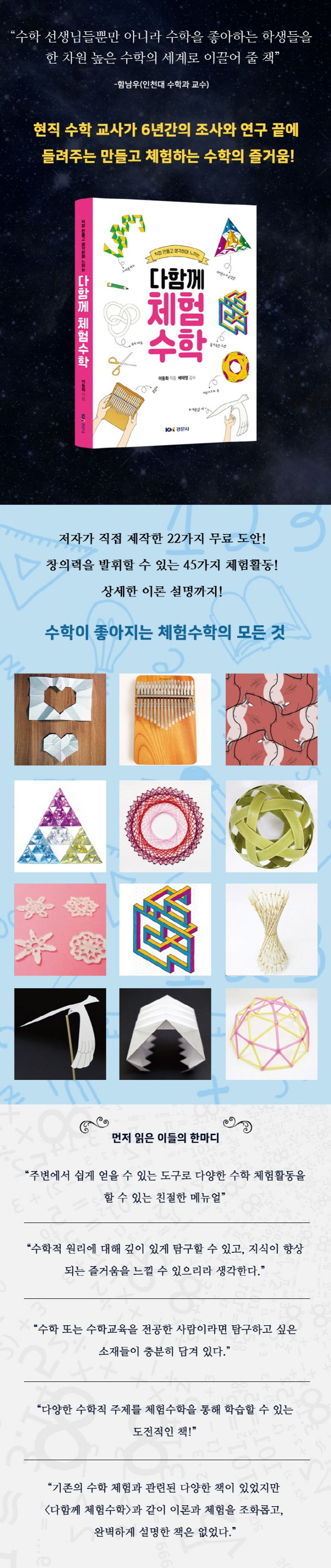 수학적 구조물을 직접 만들고 탐구하는 체험수학, 영재교육이나 동아리 운영을 위해 시도해보고 싶으나 소재도 찾기 힘들고, 비싸고 구하기 힘든 재료로 쉽게 접근할 수 없는 현실. 그뿐만 아니라 자세한 이론 설명이 부족해 어려움을 겪는 교사들을 위해 학교 수학선생님이 직접 나섰습니다.