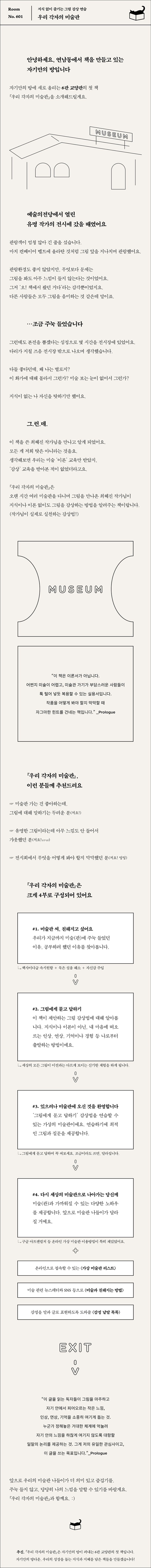 총 4장으로 구성된 이 책은 1장 화이트큐브 전시방식과 해독 안 되는 전시설명문 등 우리의 감상 행위에 영향을 미쳐온 외부 요인들을 살펴보며 2장 그림에게 묻고 답하기에선 그림을 마주하고 자기 안에 피어오르는 작은 느낌, 인상, 연상, 기억이나 경험 등을 통해 감상하는 법을 알려준다. 3장 있으려나 미술관에 오신 것을 환영합니다는 감상법을 훈련할 수 있는 가상 미술관으로 저자와 함께 큐레이팅한 6개 전시실을 돌며, 그림을 만나고 예시 질문에 답해본다. 마지막 4장에서는 미술(관)과 가까워질 든든한 노하우를 알려준다. 언제 어디서나 미술을 즐길 수 있는 가상 미술관 ‘구글 아트앤컬처’ 활용법 등을 통해 재미있는 미술 감상법을 만날 수 있다.
