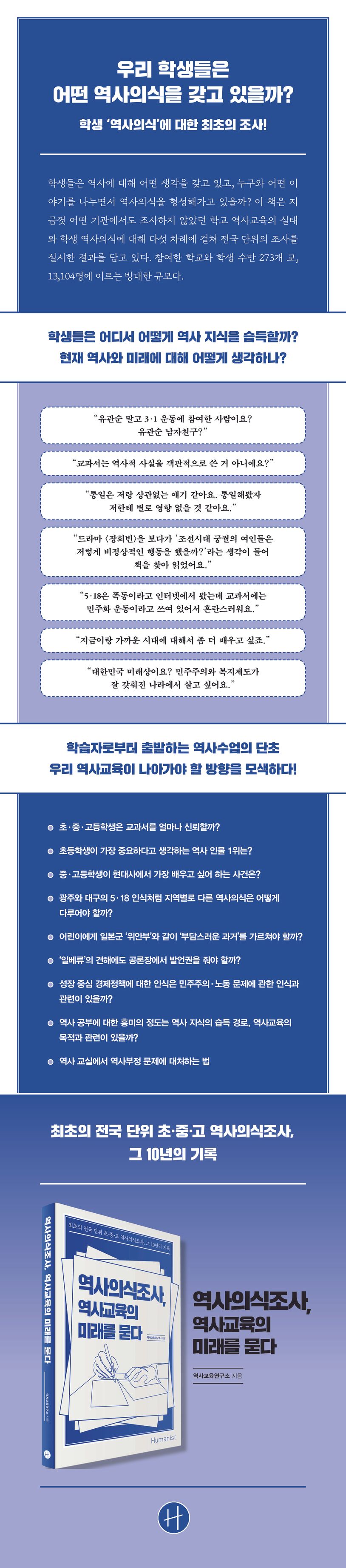 『역사의식조사, 역사교육의 미래를 묻다』는 최초의 전국 단위 규모 역사의식조사 기록을 담고 있다. 역사교육연구소와 전국역사교사모임은 2009년 조사팀을 꾸려 2010년을 시작으로 2016년에 이르기까지 중등 5회, 초등 3회에 걸쳐 학교 역사교육의 실태와 학생 역사의식에 대해 전국 단위의 대규모 학생 조사를 진행했다. 참여한 학교와 학생 수만 누적 273개 교, 13,104명에 이르는 방대한 규모다. 학생뿐만 아니라 교사를 대상으로 한 조사도 포함했으며, 객관식 설문조사의 한계를 극복하기 위해 심층 면접과 수업 관찰 역시 병행했다. 조사팀 구성에서부터 설문지 문항 수립, 조사 결과 분석에 이르기까지, 10여 년에 걸쳐 쌓아온 치열한 연구와 토론의 결과가 갈피마다 생생하다.