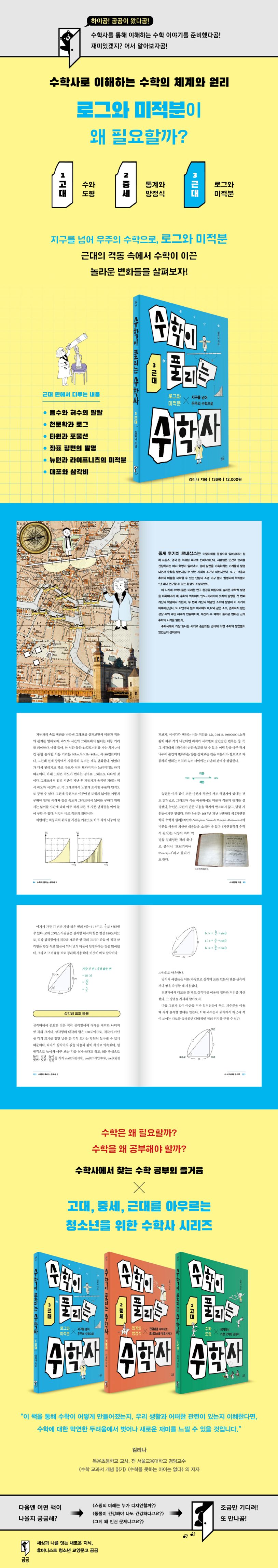 이 책은 고대부터 근대 초기까지 수학사의 주요한 장면들을 중학생 눈높이에 맞춘 글쓰기와 역사적 현장감이 살아 있는 시각 자료를 바탕으로 풀어낸다. 어려운 공식 암기와 지겨운 문제 풀이로 수학에 흥미를 잃은 학생들에게 수학의 재미를 일깨워줄 책이다. 《수학이 풀리는 수학사 3 근대》는 로그와 미적분의 발명을 중심으로 근대 수학사를 살펴본다. 큰 수의 계산을 간편하게 만들어준 로그, 자연 현상을 합리적으로 분석하기 위해 필요했던 미적분 등 근대 수학의 놀라운 성취를 살펴본다.