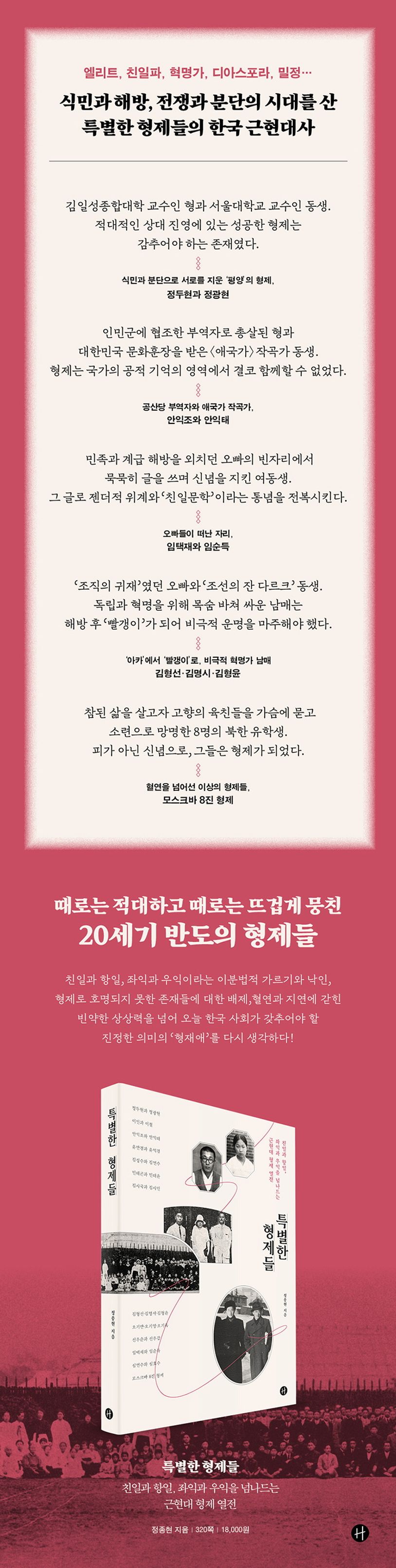 김일성종합대학 교수와 서울대학교 교수, 검찰총장과 남로당원, 공산당 부역자와 〈애국가〉 작곡가. 이처럼 함께 나고 자랐지만 서로 다른 삶의 굴곡을 보이는 형제들에서부터 식민지 해방과 혁명 전선에 함께 뛰어든 혁명가 형제·남매들, 민족과 제국의 경계에 선 식민지 조선의 기업인 형제와 대한민국임시정부 처단 대상에 나란히 이름을 올린 매국노와 밀정 형제 그리고 피가 아닌 신념으로 뜨거운 연대를 보여준 의형제들까지, 이 책은 13쌍의 형제를 통해 한국 근현대사를 들여다본다.