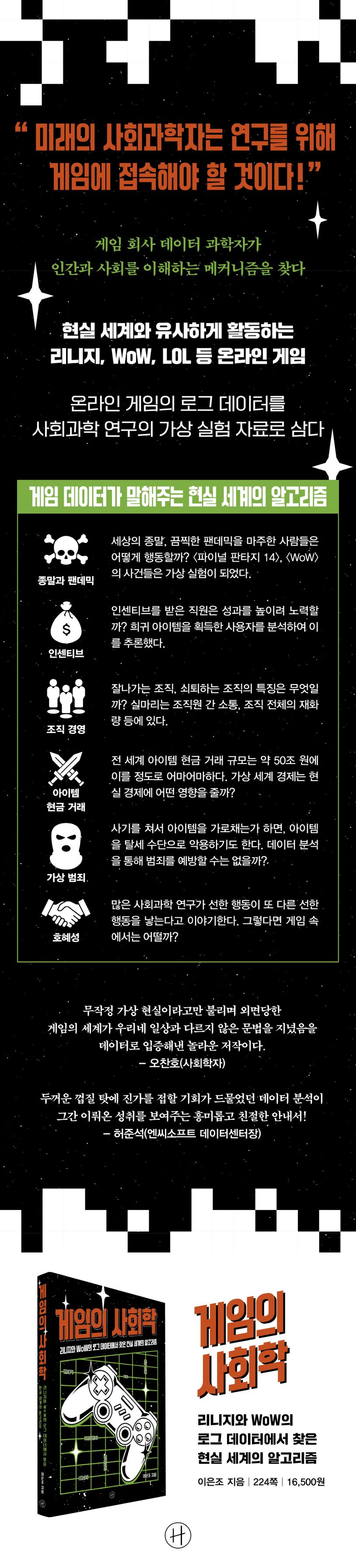 많은 이가 게임을 그저 현실과 동떨어진 가상 세계의 유희로 치부한다. 하지만 오늘날 온라인 게임은 사용자가 현실 세계와 거의 유사하게 다양한 활동을 할 수 있고, 게임 데이터 분석을 통해 이를 세밀하게 관찰할 수도 있다. 그렇다면 게임에서 인간 심리와 사회 현상을 이해하는 메커니즘을 발견할 수 있지 않을까? 이 책은 게임 데이터 분석과 연구를 바탕으로 팬데믹, 종말, 인센티브, 조직 경영, 호혜성 등 사회과학의 주제를 파헤친다. 리니지, WoW, 파이널 판타지, LOL의 로그 데이터가 우리에게 전해주는 흥미진진한 지식과 통찰을 만나보자.