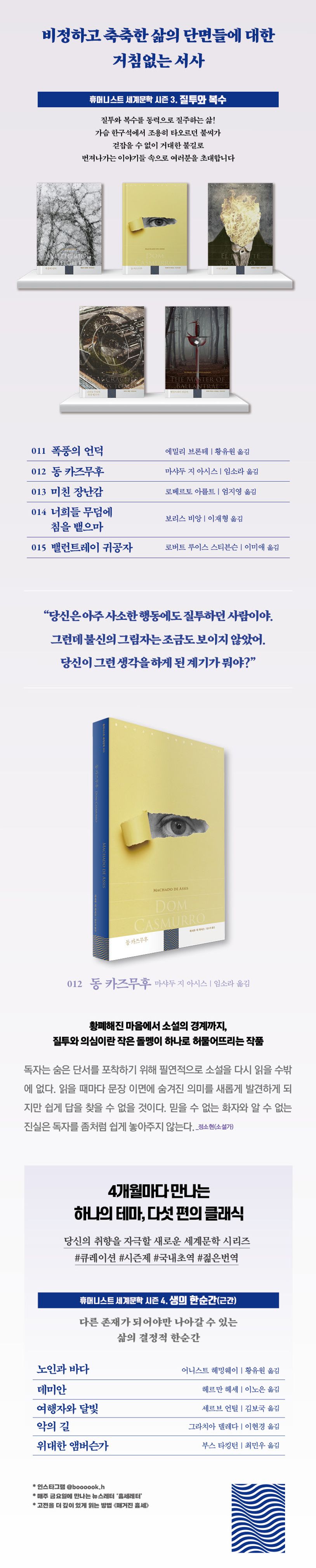 브라질의 대문호이자 심리소설의 대가인 마샤두 지 아시스의 대표작이다. 국내 초역이며, 아시아권 언어로 번역되는 것도 이번이 처음이다. 그가 남긴 열 편의 장편소설과 이백여 편의 단편소설 가운데서도 가장 뛰어난 작품으로 손꼽힌다. 브라질에서는 국민 대부분이 알고 있으며 현재까지 드라마, 영화, 연극 등으로 끊임없이 재생산되고 있다. ‘무뚝뚝 경’이란 뜻의 ‘동 카즈무후’라 불리는 주인공이 자신의 친구를 닮아가는 아들을 보며, 끊임없이 아내를 의심하고 질투하는 과정을 회고의 형식으로 그렸다. ‘질투와 의심’이란 작은 돌멩이 하나로 황폐해진 주인공의 마음과 소설의 경계까지 자유롭게 넘나들며 허물어뜨리는 보기 드문 작품. 유머를 잃지 않는 문체와 백사십여 개의 짧은 장들로 이루어진 까닭에 빠르게 읽히지만, “믿을 수 없는 화자와 알 수 없는 진실은 독자를 좀처럼 쉽게 놓아주지 않는다”(소설가 정소현 추천사).
