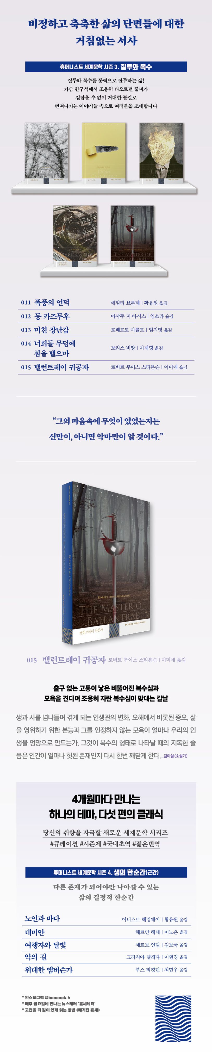 《보물섬》, 《지킬 박사와 하이드 씨》의 작가 로버트 루이스 스티븐슨의 장편소설로 국내 초역이다. 스코틀랜드와 인도, 뉴욕을 오가는 형제 복수극으로, 방종하지만 가족의 사랑을 독차지하는 형과 선하지만 따분한 동생의 대비가 두드러진다. 특히 형 ‘밸런트레이 귀공자’를 두고 스티븐슨은 “인간에게서 생각할 수 있는 모든 악을 구현한 인물”이라고 말한 바 있다. 성경 속 카인과 아벨, 야곱과 에서를 연상시키는 형제간의 갈등은 가장 작은 단위에서의 원형적 인간관계를 나타낸다. 굵직한 사건들로 속도감 있게 진행되면서도 섬세한 심리묘사를 놓치지 않는, 페이지터너로서의 스티븐슨의 면모가 돋보이는 작품이다.