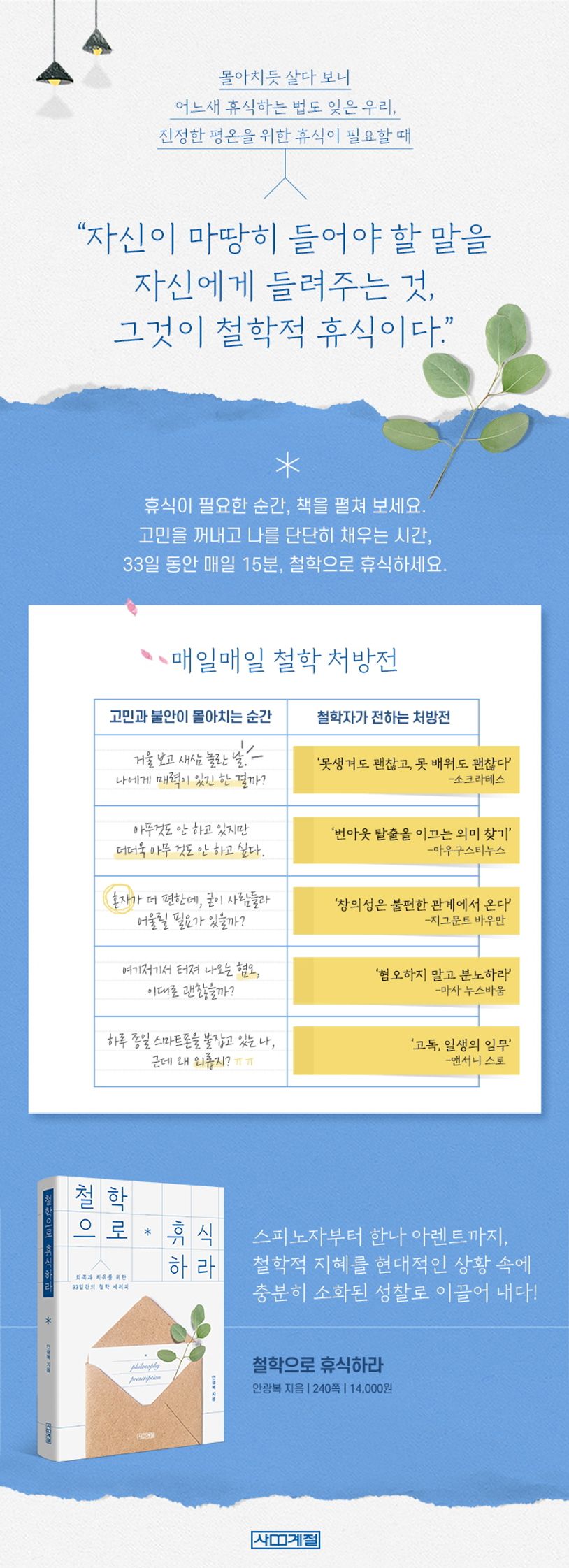 철학을 삶을 위한 휴식으로 바꾸 시간『철학으로 휴식하라』. 어떤 나이이든지 어떤 상황에 처해 있든지, 심각한 인생 고민은 누구에게나 있다. 좋아지지 않는 경제 상황, 마음과는 달리 풀리지 않는 인간관계, 사랑이나 돈 또는 인정에 대한 욕망 등. 이러한 고민은 인생의 굽이굽이에 차례로 나타나게 마련이다. 불확실한 미래, 사회에 대한 불만, 정체성이나 자존감, 죽음의 문제까지. 문제는 언제나 있다. 하지만 누구도 시원한 답을 주지는 못한다. 게다가 자아를 짓누르는 고민들은 휴가를 떠나도 진정한 휴식을 방해한다.