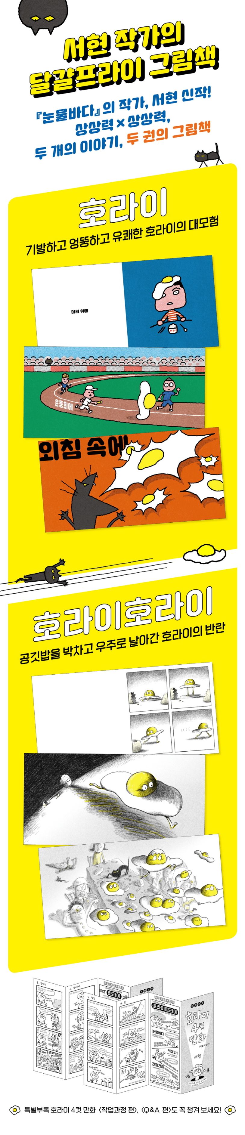 평소 노란색을 좋아하는 작가가 달걀프라이를 발견한 것은 어찌 보면 자연스럽고 운명적인 만남이다. 달걀프라이에서 시작한 상상은 시공간을 자유자재로 날아다니는 호라이의 모험으로, 또 하나의 상상은 알에서 태어난 호라이의 우주 이야기로 뻗어 나간다. 두 편의 이야기가 멈추지 않고 내내 끝없이 펼쳐질 것 같은 기운을 품고 있어서 뛰어난 이야기꾼으로서 작가의 면모를 확인할 수 있다.