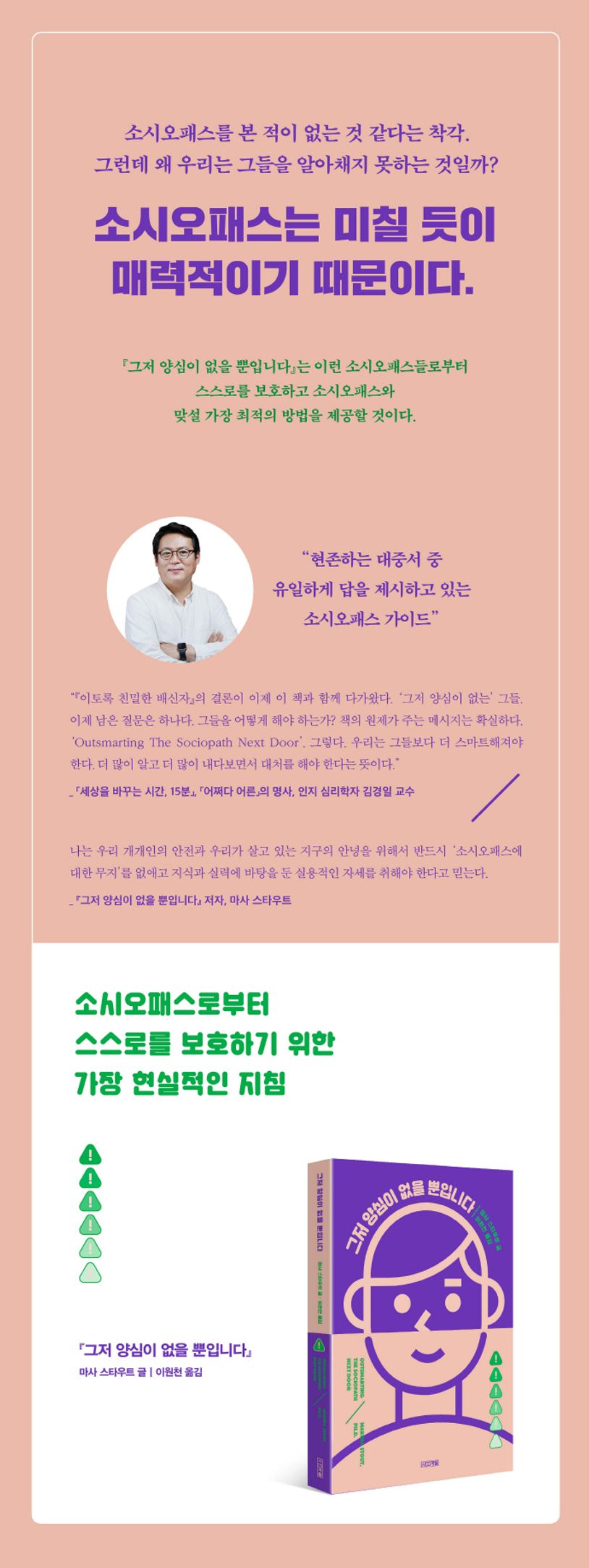 25명 중 1명, 우리 곁에 존재하는 소시오패스. 피하는 게 답이다. 그런데 도저히 피할 수 없는 상황이라면? 『이토록 친밀한 배신자』의 저자이자, 하버드 의과 대학교 정신과 교수, 심리 상담가 마사 스타우트 박사가 이번에는 피할 수 없는 소시오패스에 대처하는 명확한 지침을 가지고 찾아왔다. 소시오패스인 부모ㆍ자녀ㆍ배우자, 사정상 관둘 수 없는 직장의 동료, 지도 교수, 담당의, 일면식도 없으면서 사이버 폭력을 행사하는 소시오패스 등으로부터 겪는 생생한 사례와 구체적인 대응법이 담겨 있다. 여기서 한 발 더 나아가 기업과 정부에 존재하는 소시오패시의 사례를 함께 살펴보면서 양심, 사랑과 연대의 중요성을 되짚는다. 이 한 권으로 소시오패스가 나의 삶에 얽히지 않도록 예방하고 소시오패스와 대치 중이라면 현명한 대처법을 얻을 수 있을 것이다.