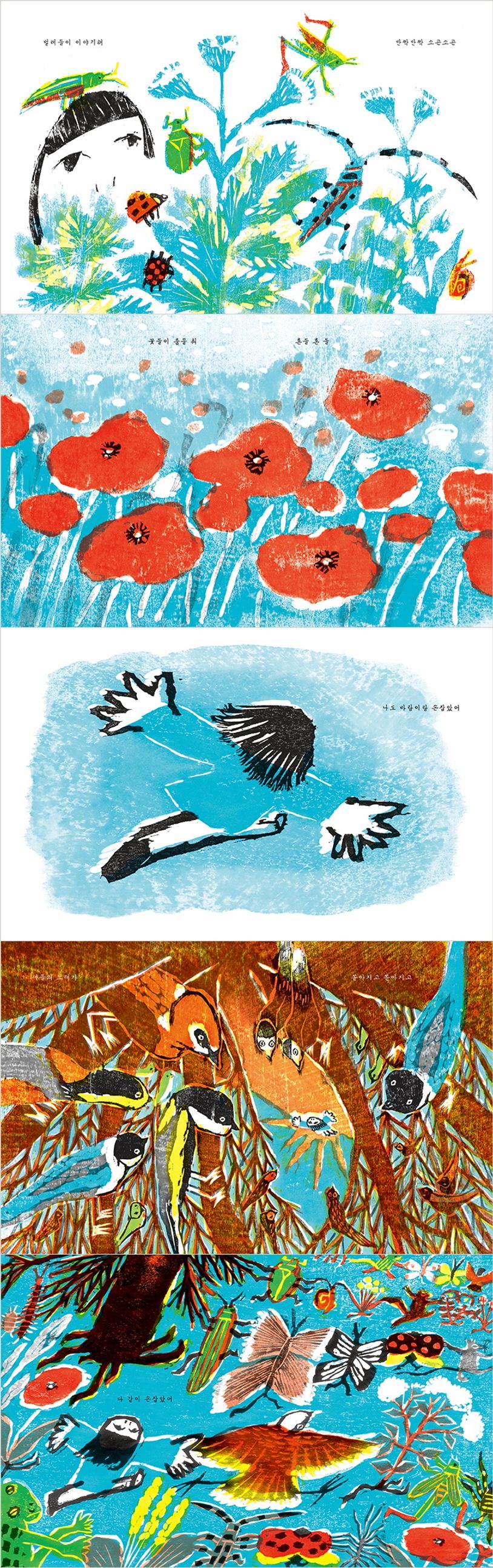 책을 처음 마주하면 노란 햇살에 물들어 환하게 웃는 얼굴이 보이고 자켓을 걷으면, 무당벌레 한 마리가 날아올라 독자를 이끈다. 그리고 책을 펼쳤을 때, 독자는 노란 면지 뒤로 꽃 위에 앉은 무당벌레를 살짝 보게 된다. 꼭 햇볕 따스한 어느 날을 보는 것만 같다. 사소한 지점까지 작가의 꼼꼼한 배려와 의도가 돋보인다. 이 책은 언제 어디서나 우리를 자연 한가운데로 데려다줄 것이다. 마치 작가의 원화를 소장하는 듯한 생생한 감동을 선물하는 그림책이다.