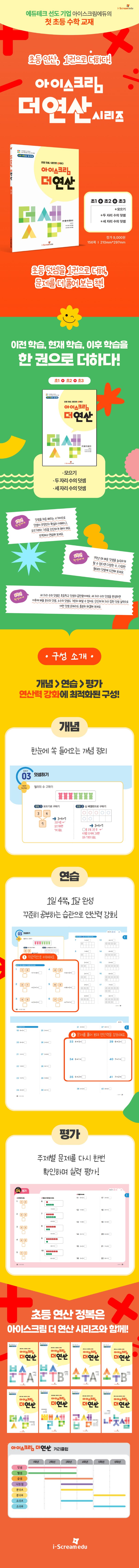 『아이스크림 더 연산 덧셈』으로 덧셈의 개념을 확실히 알고, 기초를 단단하게 쌓고, 학습한 내용을 잊어버리지 않게 꾸준히 공부하는 습관을 길러 보세요. 든든한 초등 연산력의 기초가 되어 줄 것입니다.