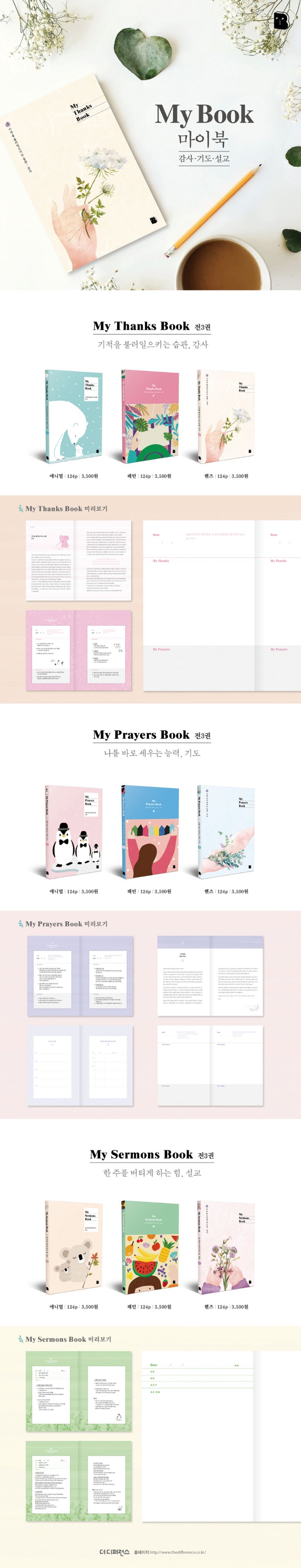 감사는 최고의 항암제요 해독제요 방부제다(존 헨리). 가장 행복한 사람들은 가장 많이 소유한 사람들이 아니라, 가장 많이 감사하는 사람들이다(빌헬름 웰러). My Thanks Book은 그날의 감사한 일들을 기록할 수 있는 다이어리 형태로 되어 있다. 연령과 취향에 따라 선택할 수 있도록 표지도 3종으로 구성하였다. 감사의 의미를 되새겨볼 수 있는 명언을 넣어 짧은 묵상을 해보고, 감사 거리와 기도 내용을 적어 볼 수 있다. 가방에 넣고 다니기 좋은 가볍고 작은 사이즈로 언제 어디서든 감사거리가 생각나면 노트에 적어, 하루를 의미 있게 채워보자. 우리는 감사할 수 있는 내용이 정말 많음에도 불구하고 가지고 있는 것보다 부족한 것, 갖지 못한 것을 늘 바라보며 불평하곤 한다. 감사 거리는 사소하고 평범한 것이어도 좋다. 일상에서 감사를 찾으며 정말 중요하고 영원한 것이 무엇인지 깨닫고, 감사의 놀라운 힘을 경험하길 기대한다.