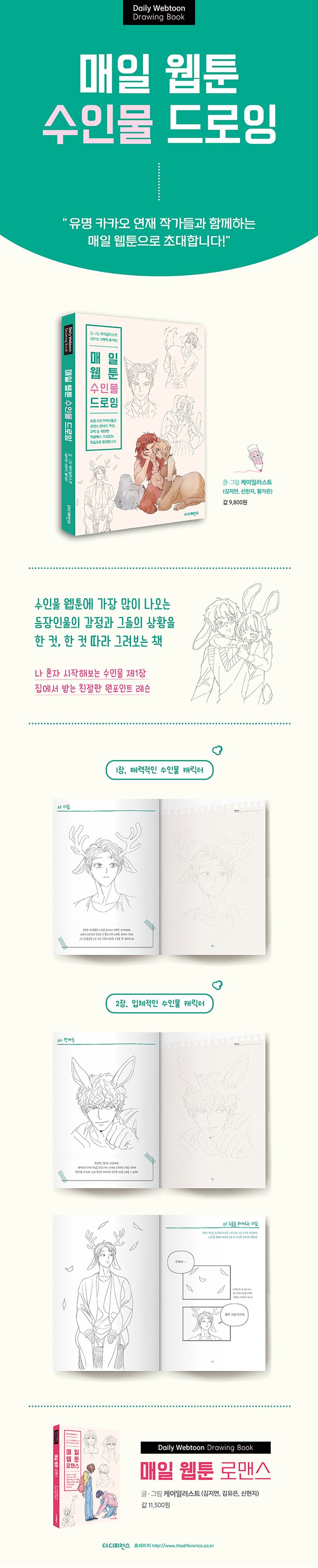 〈매일 웹툰 수인물 드로잉〉은 현재 카카오 등에서 연재하는 현업 웹툰 작가들이 인기 웹툰의 캐릭터 스타일과 다양한 사건, 상황을 분석하여 웹툰 작가를 꿈꾸는 예비 작가들이 언제 어디에서나 쉽고 간편하게 연습할 수 있도록 총 55개의 연습용 캐릭터를 넣어 구성한 웹툰 드로잉 책이다.