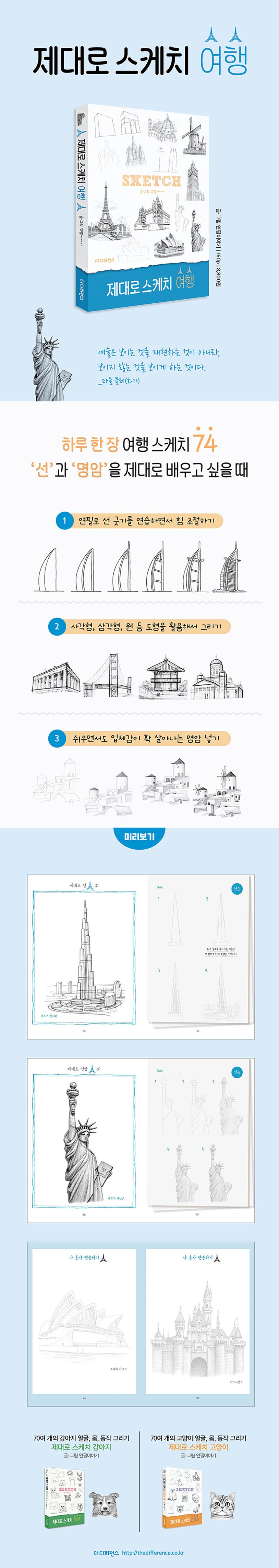 『제대로 스케치 여행』은 화실 선생님이 알려주는 그림의 기본기인 ‘선’과 ‘명암’을 약 70여 번 연습해볼 수 있도록 구성한 스케치 책입니다. 이번 주제는 ‘여행’입니다. 다양한 여행지의 랜드마크, 유적, 건축물 등을 그리면서 그림의 기본기와 재미를 모두 잡을 수 있습니다.