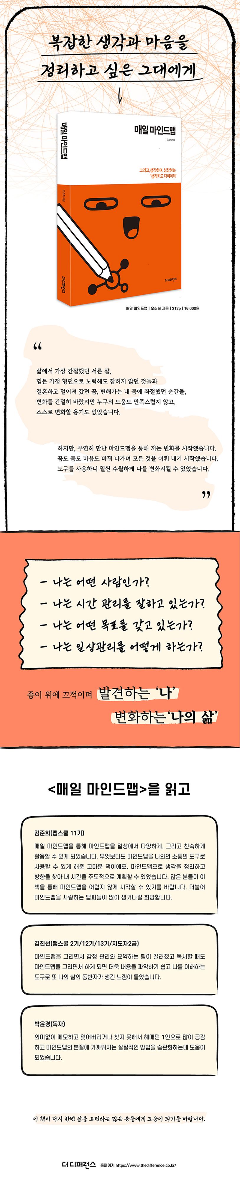 마인드맵을 활용할 수 있는 주제들은 무궁무진하고, 어떤 것이든 가능하다는 저자는 우리 생활과 밀접한 내용인 ‘자기 관리/시간 관리/목표 관리/일상 관리/정보 관리’ 5개 파트로 나누어 보여 주고 있다. 나의 장점, 나의 고민, 하고 싶은 것, 아이들에게 보여 주고 싶은 내 미래의 모습, 꿈 일기 등 소소한 주제이지만 머릿속에 있는 복잡한 생각들을 단순히 그려 보기만 해도 생각이 정리되고, 새로운 생각을 불러일으키고, 삶이 긍정적으로 변화되는 것을 경험할 수 있을 것이다.