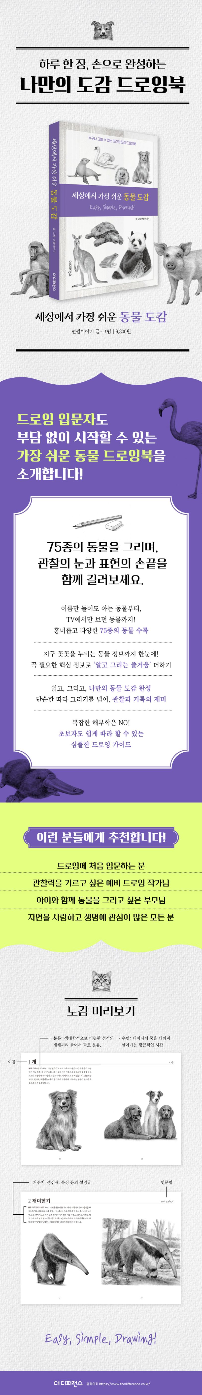 『세상에서 가장 쉬운 동물 도감』은 드로잉 입문자도 부담 없이 따라 그릴 수 있도록 구성된, 가장 쉬운 동물 드로잉북입니다. 그림만 따라 그리는 책이 아닙니다. 이 책은 동물 하나하나에 꼭 필요한 정보만 담아, ‘알고 그리는 재미’를 더했습니다. 그림을 좋아하는 독자라면, 단순한 따라 그리기를 넘어 동물의 생김새를 직접 관찰하며 표현하는 즐거움을 경험할 수 있을 거예요.