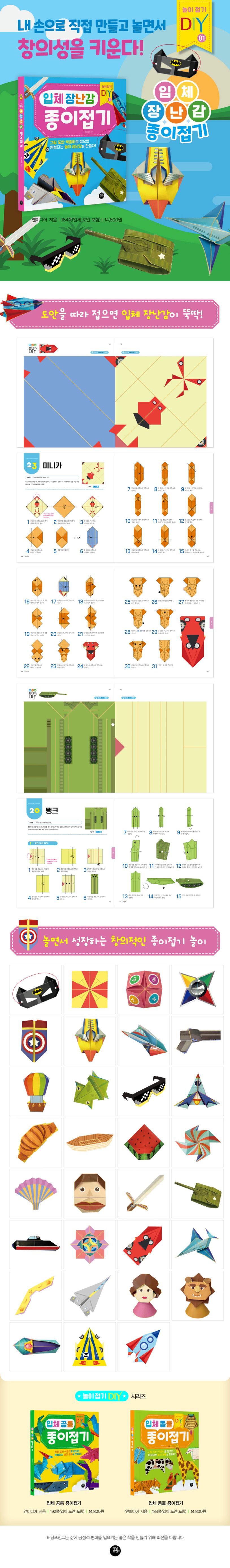 친절한 설명대로 책속 부록으로 제공되는 입체 도안 색종이로 베트맨 가면, 마블 방패, 표창, 말하는 인형, 제트기, 우주선, 전투팽이, 선글라스, 부메랑, 레이싱카, 미녀와 야수 등 다양한 장난감을 접고, 놀다보면 쑥쑥 자라는 내 아이를 만날 수 있어요.