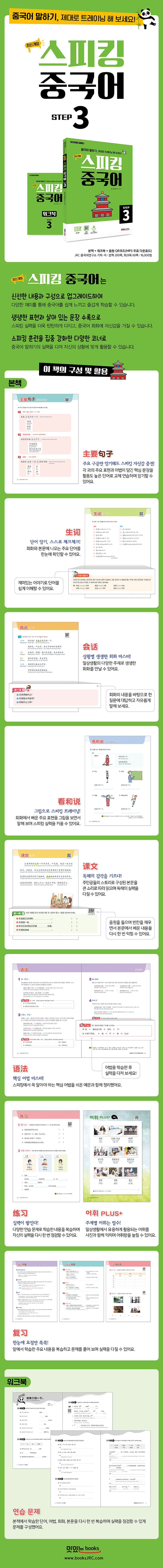 『최신 개정 스피킹 중국어 STEP 3』은 『NEW 스피킹 중국어 입문』의 개정판으로 내용을 새롭게 업그레이드하여 회화와 어법을 공부한 후에 스피킹 실력을 더욱 탄탄하게 다질 수 있습니다. 또한 정확하고 유창한 중국어 구사와 중국인의 실생활에서 유용하게 활용되는 어휘까지, 다양한 재미를 통해 여러분이 중국어 회화에 자신감을 가질 수 있도록 도와드릴 것입니다.