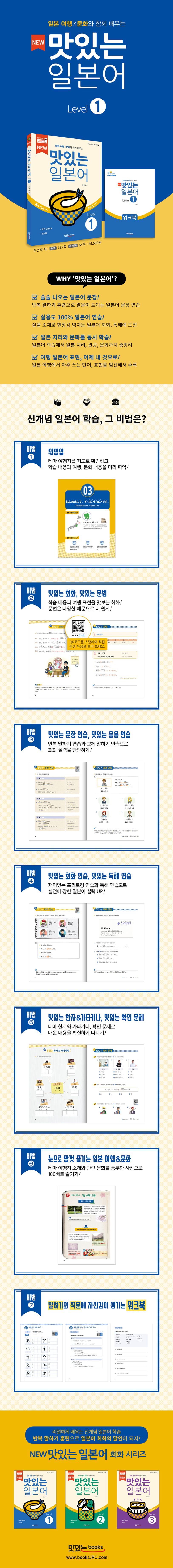 『NEW 맛있는 일본어 Level1』은 입문부터 시작하는 일본어(학습)에 여행(체험), 문화(흥미)를 결합한 신개념 일본어 학습서다. 과마다 테마 지역을 설정하고 일본어뿐만 아니라 일본 지리, 관광, 문화까지 배울 수 있다. 또 말문이 트이는 반복 문장 연습과 실생활에서 접할 수 있는 것을 소재로 만든 회화, 독해 연습으로 실전에 강한 일본어 실력을 키울 수 있다. 그밖에 본책과 워크북에는 음성 재생용 QR코드를 실어서 언제나 어디서나 스마트폰으로 음성을 들으면서 말하기 연습을 할 수 있도록 구성되어 있다.