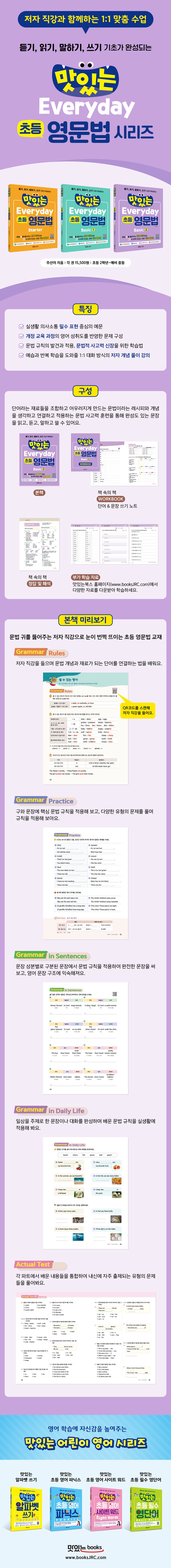 『맛있는 Everyday 초등 영문법 Basic』은 단어라는 재료들을 조합하고 어우러지게 만드는 문법이라는 레시피를 통해 완성도 있는 문장을 읽고, 듣고, 말하고 쓸 수 있도록 슬기로운 단어 재료 사용법을 알려줍니다. 또한 문법 용어에 담긴 개념을 생각해 내고, 단어와 개념, 개념과 개념을 서로 연결하여, 문장에 적용하는 문법 사고력을 키워, 실생활에서 문장을 읽고, 쓰고, 듣고, 말하기가 가능하도록 했습니다. 영어 교육 전문가 저자의 친절하고, 명쾌한 강의로 혼자서도 부담 없이 자가 주도 학습이 가능하며, 다양한 부가 자료로 반복적인 학습을 통해 문법의 기초 근육을 키울 수 있도록 도와줄 것입니다.