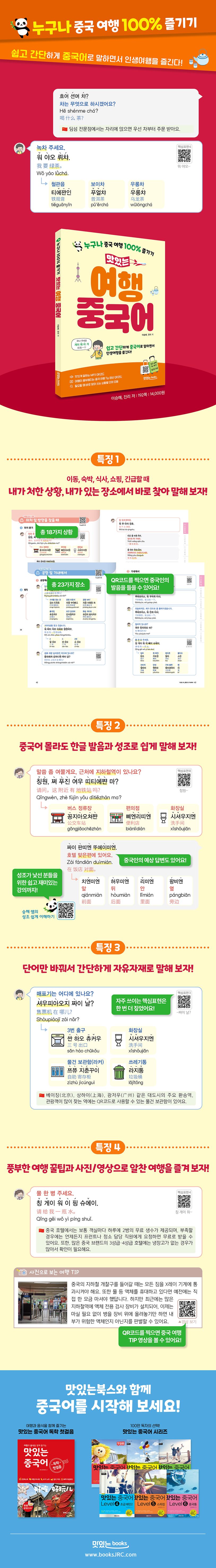 『맛있는 여행 중국어』는 한국인&중국인 선생님의 생생한 표현과 여행 꿀팁을 수록해 누구나 쉽고 간단하게 중국어로 말하면서 인생여행을 즐길 수 있는 책입니다. 이동, 숙박, 식사, 쇼핑, 관광, 긴급할 때 언제 어디서든 하고 싶은 말을 쉽게 찾아 말할 수 있습니다. 한글 발음과 성조를 수록해 중국어를 몰라도 중국어로 쉽게 말할 수 있고, 중국인의 답변까지 충분히 수록해 든든합니다. 중국 여행에서 자주 사용되는 핵심 표현을 선정해 책 앞부분과 해당 표현이 사용된 문장을 수록하여 애써 외우지 않아도 책을 읽기만 하면 자연스럽게 스스로 중국어로 말할 수 있게 됩니다. 무엇보다 재미있고 유용한 꿀팁과 생생한 중국 여행 Tip 영상까지 담아 철저한 여행 준비도 가능합니다.