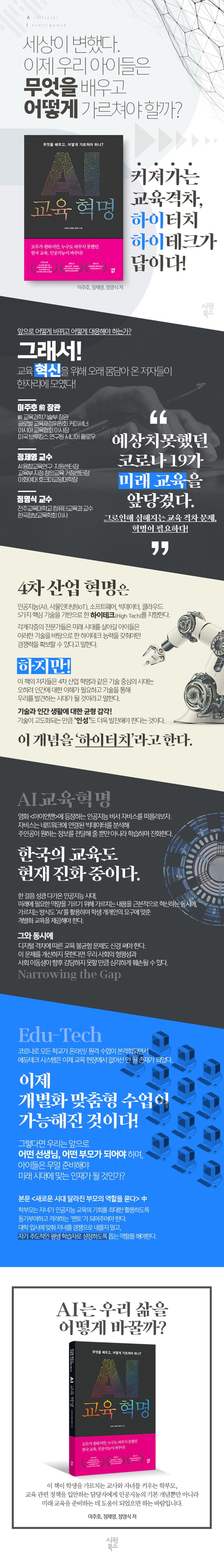 이 책은 어느 때보다 새로운 미래를 살아갈 자녀들을 위해 학교 교육이 어떤 역할을 해야 하는지에 대한 실천적 대안과 비전을 담은 교육 제안서다. 한 걸음 성큼 다가온 인공지능 시대에 교육은 무엇을 가르쳐야 하고, 어떻게 가르쳐야 하는가에 대한 구체적인 논의를 담고 있다. 즉 미래에 필요한 역량을 기르기 위해 가르치는 내용을 근본적으로 혁신하는 동시에, 가르치는 방식도 ‘인공지능(AI)’을 활용하여 학생 개개인의 요구에 맞춘 ‘개별화 교육’을 제공하는 대안을 제시하고 있다. 인공지능의 뛰어난 기술적 기능을 활용하여, 경쟁 학습이 아니라 학생 개개인의 역량 및 성취를 소중히 여기는 교육의 본질에 집중해야 한다는 뜻이다. 실제 전·현직 교육부 장관이자 교육 정책 담당자로서 교수로서 교육 혁신을 위해 오래 몸담아 온 저자들은 오늘의 교육이 미래를 살아갈 내일의 학생을 가르칠 준비가 되었는지 돌아보고, 작은 변화라도 실천적인 걸음을 내딛어야 한다고 제안한다.