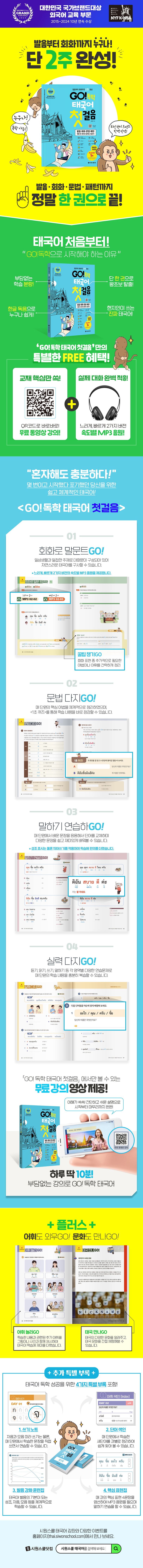 『GO! 독학 태국어 첫걸음』은 태국어를 처음 시작하는 학습자들이 어렵지 않게 태국어 발음부터 회화까지 2주 만에 왕초보를 탈출할 수 있도록 구성한 교재입니다. 네이티브들이 실생활에서 자주 쓰는 생생한 태국어 표현을 수록하였으며, 누구나 쉽게 부담 없이 태국어를 학습할 수 있도록 한글 독음 제시는 물론, 태국어 띄어쓰기를 적용하였습니다.
