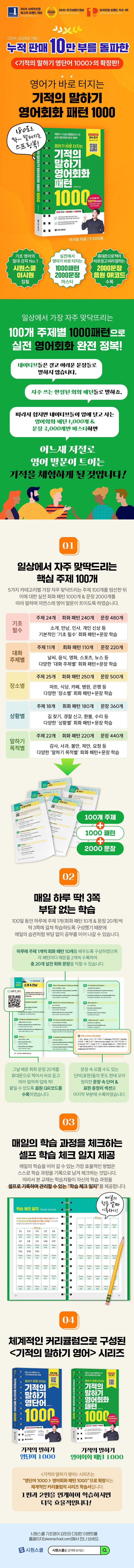 2019년도에 출간된 후 2025년까지 누적 판매 부수 10만 부를 돌파한 〈기적의 말하기 영단어 1000〉의 확장판! 영단어에 이어 ‘실전 영어회화 문장’까지 구사할 수 있도록 기초영어의 절대 강자 ‘시원스쿨 이시원 강사’가 일상에서 가장 빈번히 맞닥뜨리는 주제 100개를 엄선한 뒤 이에 대한 ‘필수 영어회화 패턴 1000개’를 회화 문장 2000개를 따라 말하며 마스터하도록 설계한 학습서입니다.