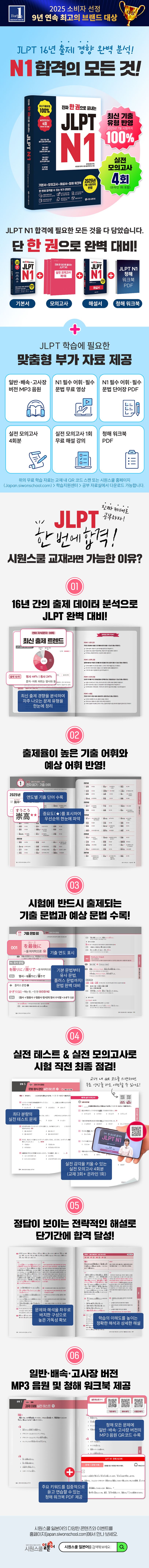 『진짜 한 권으로 끝내는 JLPT N1』은 2010년부터 2025년까지의 출제 경향을 철저히 분석하여, 시험에 자주 출제되는 문제 유형을 체계적으로 반영한 JLPT N1 완벽 대비서입니다. 문자·어휘, 문법, 독해, 청해 각 영역을 종합적으로 학습할 수 있도록 이론 설명부터 연습 문제, 실전 테스트까지 단계별로 구성하였으며, 특히 실전 테스트와 실전 모의고사 4회분(교재 3회분 + 온라인 1회분)에는 풍부하고 다양한 문제를 담아 마지막까지 철저히 대비할 수 있습니다. 최신 출제 경향을 반영하여 가장 많은 문제를 담았으며, 2010년부터 2025년까지 출제된 기출 어휘와 문법을 연도별로 정리하고, 출제 가능성이 높은 예상 어휘와 문법을 별도로 제시하였습니다. 모든 문제에는 정확한 해석과 상세한 해설을 제공하여 학습자의 이해를 돕고, 사용된 어휘 역시 체계적으로 정리되어 있어 효율적인 학습이 가능합니다.