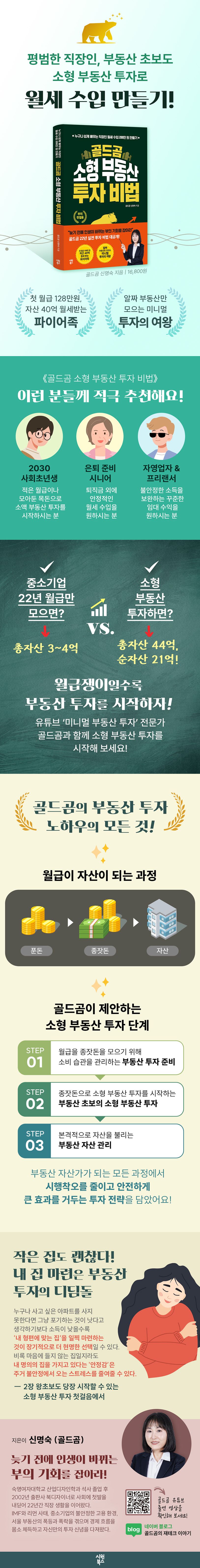 저자는 첫 월급 128만 원으로 직장 생활을 시작해 22년간 중소기업에서 일하며 누구의 도움 없이 소형 부동산에 투자해 총자산 44억 순자산 21억, 자동 현금 흐름 250만 원을 달성하고 40대에 조기 은퇴에 성공한 ‘골드곰’이다. 골드곰 신명숙 저자는 네이버블로그 ‘골드곰의 재테크 이야기’를 통해 투자 정보를 공유해왔으며, 조기 은퇴 후 유튜브 머니투데이 싱글파이어, 세계일보 머니파인더에 출연하며 ‘소형 부동산 투자’와 ‘미니멀라이프’로 큰 화제가 되었다.