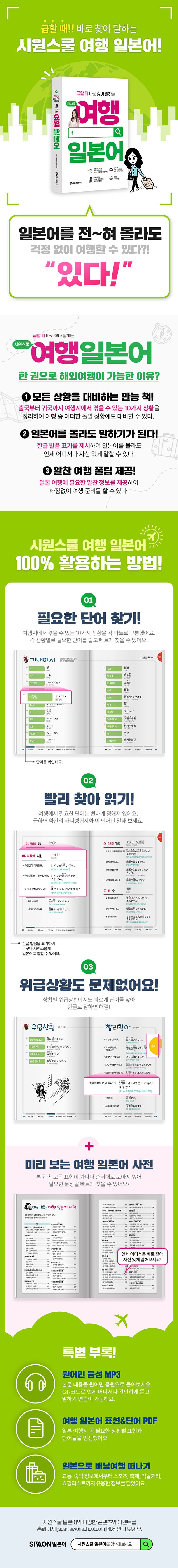 ≪시원스쿨 여행 일본어≫는 일본 여행에서 겪을 수 있는 유용한 상황별 필수 단어와 표현들을 크게 10가지 상황으로 분류하여 정리한 도서이다. 여행 준비부터 귀국까지 여행 전반에 도움이 되는 일본 입국 정보, 유용한 앱 추천 등 알찬 정보를 수록했다. 또한 일본어를 모르는 독자를 위해 의사소통에 어려움이 없도록 한글 발음 표기는 물론 원어민 MP3와 여행일본어 표현&단어 PDF를 부가자료로 제공하였다.