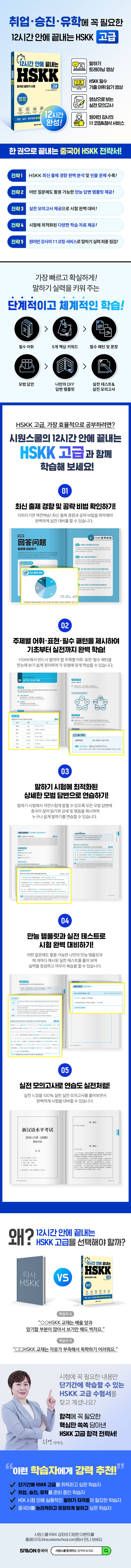 『12시간 안에 끝내는 HSKK 고급』은 최신 출제 경향을 완벽 분석하고 시험에 자주 출제되는 문제만 엄선하여 단기간에 합격할 수 있도록 도와주는 HSKK 고급 합격 보장 전략서입니다. 어떤 질문에도 활용 가능한 만능 템플릿과 말하기 시험에 최적화된 학습 자료 및 원어민의 1:1 코칭 서비스로 누구나 쉽게 HSKK 고급에 합격할 수 있습니다. 필수 어휘 → 필수 표현 및 핵심 키워드 → 모범 답변 → 나만의 DIY 답변 템플릿 → 실전 테스트까지 단계적이고 체계적인 구성으로 단 12시간으로 HSKK 고급을 완벽 마스터할 수 있습니다.