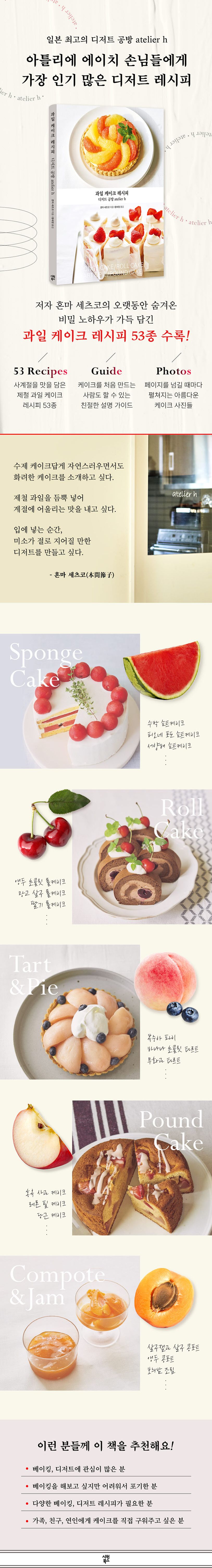 일본 최고의 디저트 공방, 아틀리에 에이치(atelier h). 사계절의 신선한 과일을 활용해 맛있는 디저트를 선보이는 이곳에서, 오랫동안 숨겨온 비밀 노하우가 가득 담긴 과일 케이크 레시피 53종을 한 권의 책으로 엮어냈다.