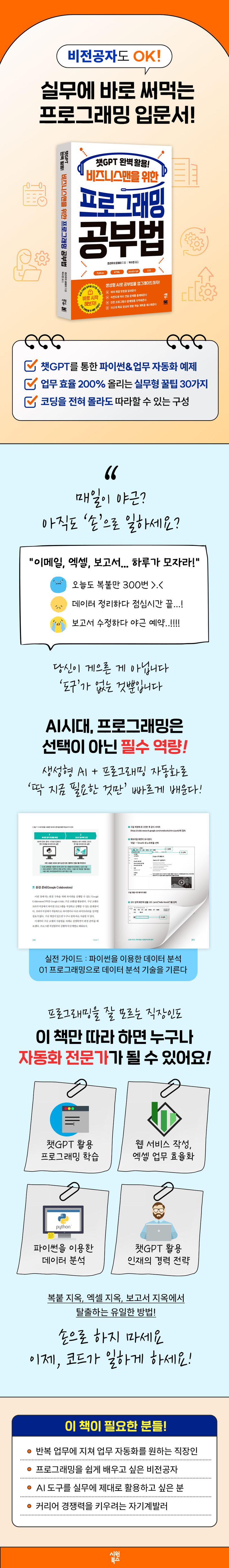 저자는 이 책을 통해 ‘프로그래밍은 개발자의 영역’이라는 고정관념을 넘어, 실무에 곧바로 활용할 수 있는 프로그래밍 역량을 누구나 갖출 수 있다는 확신을 전한다. 코딩을 전혀 몰라도, 전공하지 않았더라도 실무에서 필요한 자동화와 데이터 분석 등의 업무를 스스로 해결할 수 있도록 명확하고 실용적인 방법을 제시한다.