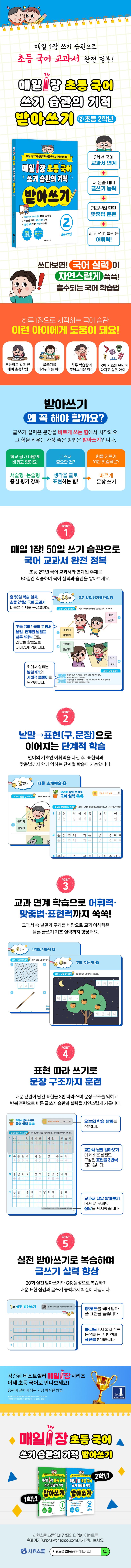 기존에 출간되어 꾸준히 인기 있는 시원스쿨의 ‘매일 1장’ 시리즈가 초등 국어 분야로 확장되었습니다. 부담 없는 하루 학습량과 체계적인 학습 과정을 통해 ‘매일의 습관’을 들이도록 설계된 ‘매일 1장’ 시리즈. 이제 ‘매일 1장 초등 국어’를 통해 초등학생들의 국어 정복이 가능합니다.