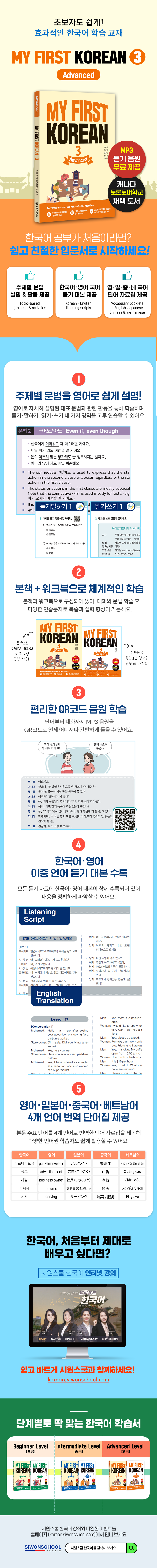 본 교재는 캐나다 등 해외에서 오랜 한국어 교육 경험을 가진 교수진이 개발한 것으로, 한국어 학습에 필수적인 내용을 중심으로 단원별 학습 목표와 다양한 활동을 제공한다. QR코드를 수록하여 한국어 발음과 실제 회화를 들을 수 있도록 구성하였으며, 주요 문법 이론을 영어로 자세히 설명하여 학습자가 더 빠르고 효율적으로 학습할 수 있도록 하였다.