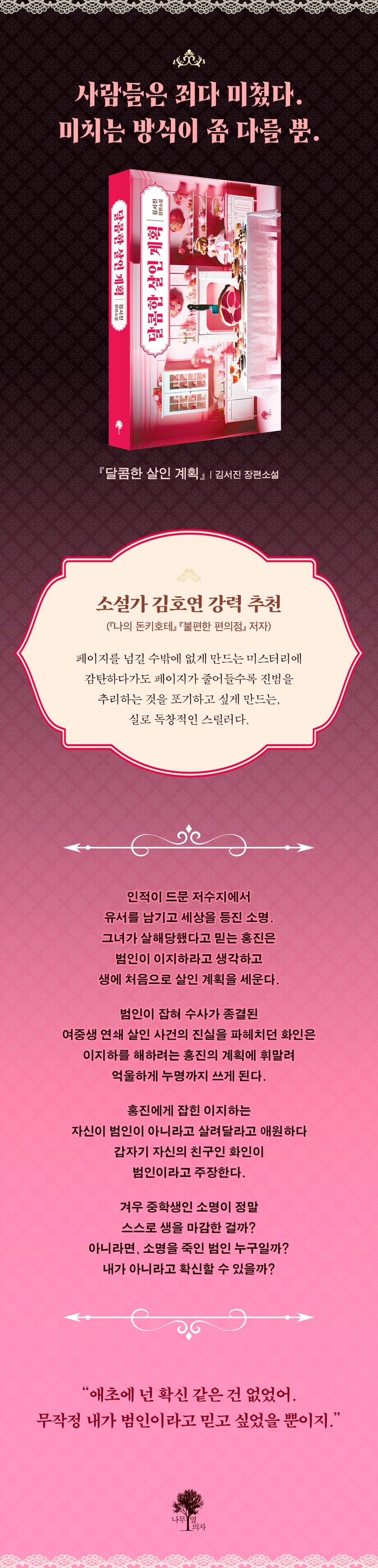 나 자신으로부터 도망치고 싶은 적이 있는가? 벗어날 수 없는 과거의 기억 때문에 괴로워 잠 못 이루고 고통 받은 적이 있는가? 이 소설은 살면서 한 번쯤 그런 기분을 경험해본 적 있는 모든 이들에게 바치는 비극적 찬가이다. 왜곡된 인간 심리를 서늘하고도 강렬하게 그린 『선량한 시민』으로 제9회 세계문학상 우수상을 수상하고, 한 집안의 60년 가족사를 묵직하게 엮어낸 『2월 30일생』으로 추리소설 작가로서의 뛰어난 역량을 재차 증명한 김서진 작가가 이번에는 한 남자의 죽음을 갖기 위해서 과거, 현재, 심지어는 미래의 자신까지도 기꺼이 내던질 준비가 되어 있는 여자의 이야기로 10년 만에 돌아왔다.