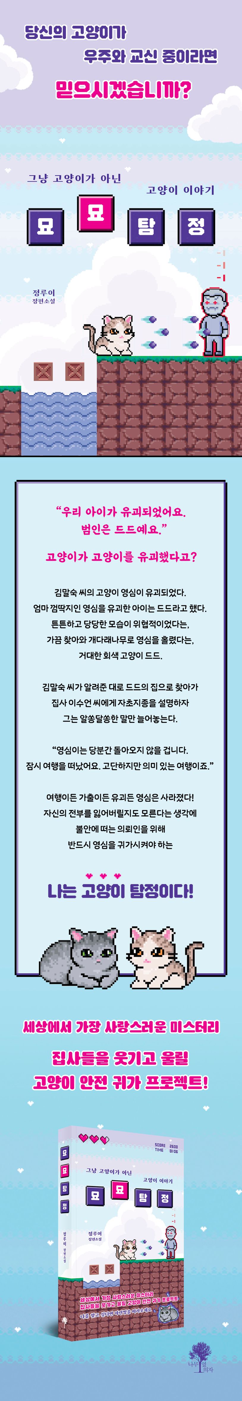 고양이를 잃어버린 이들의 절망을 목격하고 사건에 얽힌 우주의 비밀이 조금씩 드러날수록, 독자들은 ‘묘묘탐정’의 모험 속으로 빠져들어 사라진 고양이를 찾기 위한 수사에 진심을 다해 동참하게 될 터다. 더불어 책을 덮고 나서는 따뜻한 집사이자 탁월한 이야기꾼인 정루이 작가가 앞으로 세상에 펼쳐놓을 이야기들을 기다릴 수밖에 없게 될 것이다.