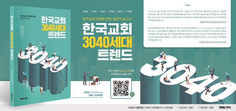 한국의 종교인구가 감소했다는 조사 결과는 수년째 계속되고 있습니다. 그런데 그 감소의 폭이 세월이 지나면서 급격하게 변하고 있다는 사실은 적잖은 위기감을 불러옵니다. 특별히 청년층의 탈종교화는 위기감을 지나 교회의 미래를 위협하는 매우 심각한 수준에까지 이르렀습니다. 여기에 더하여 기존 신자들의 가나안 현상은 교회가 맞이한 큰 위기이며 겪어 보지 못했던 시련입니다. 이 위기와 시련 앞에선 한국교회는 어떻게 해야 할까요? 이 도전과 시련을 500여 년 전 종교개혁을 일으켰던 개혁자들처럼 한국교회를 개혁하는 기회로 만들 수 있을까요? 아니면 서구의 교회들처럼 쇠락의 길을 걸어갈까요? 정말 중요한 시간에 놓인 한국교회입니다. 『한국 교회 트렌드 3040』은 이 선택의 시간에 놓인 한국교회가 마주하고 있는 문제점들 가운데 3040세대의 이슈들을 실증적 데이터로 분석하고 전문가들의 대안을 제시하고 있습니다. 직장과 가정 그리고 신앙으로 분주하게 살아가는 이 시대 3040세대에게는 위로와 새로운 길을, 그리고 다른 세대들에게는 3040세대를 이해할 수 있는 좋은 통찰을 제공합니다. 한국교회의 모든 성도들과 목회자들과 함께 이 시대 한국교회가 품고 있는 고민을 함께 해결하고자 하는 간절한 소망을 담아 펴냅니다.