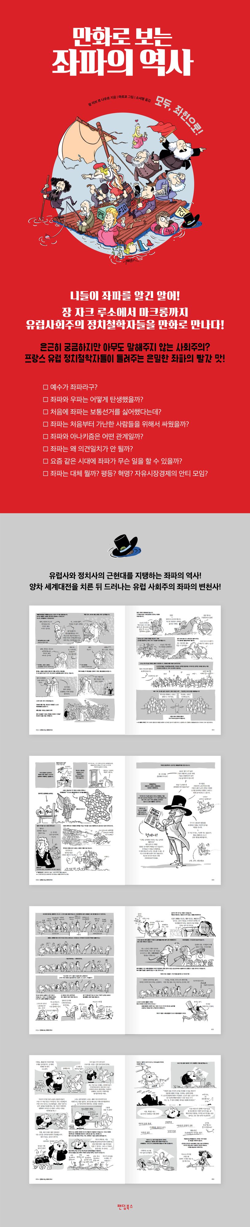 장 자크 루소부터 현재 프랑스 대통령 마크롱까지! 프랑스 좌파의 역사를 다룬 이 책은 근대 유럽역사와 정치 속 좌파의 탄생과 지금까지의 일대 사건사를 만화로 그렸다. 유토피아를 주장한 토마스 모어부터 프랑스 혁명 때 뜨겁게 활동한 생쥐스트와 상퀼로트,《자본론》으로 일약 스타가 된 칼 마르크스와 그의 추종자들, 그리고 사회주의를 기반으로 이뤄진 프랑스 좌파 정당의 변천사를 코믹하면서도 위트 있게 만들었다.
