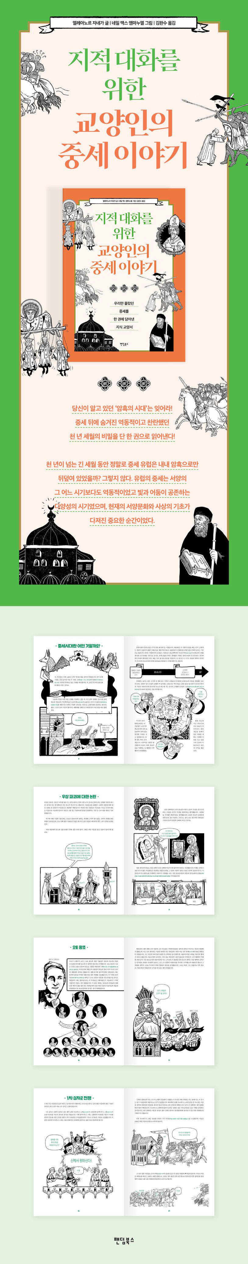 오늘날 흔히 ’중세 유럽‘이라는 말을 들었을 때, 가장 먼저 떠오르는 이미지는 과연 어떤 것들이 있을까? 용감한 기사, 웅장한 성, 왕자와 공주, 하늘 높이 솟아오른 교회, 성직자 등등. 우리가 아는 판타지 속에 나올 법한 환상적이고 멋있는 요소들이 가장 먼저 떠오르는 사람들도 있겠다. 하지만 반대로 경직된 봉건제, 억압받는 농노, 무자비한 종교재판, 흑사병과 같이 서양사에 단골로 등장하던 어두운 부분을 떠올리며 역사적으로 퇴보했던 한 시기였다고 생각하는 사람들도 있을 것이다. 그리고 이는 유럽의 중세가 이른바 ’암흑의 시대‘이었다고 오해받는 결정적인 계기라 할 수 있다. 그런 관점에서 이 책은 우리가 지금껏 단편적으로만 알고 있었던 중세 유럽의 새로운 이면과 사실을 재미있는 만화와 함께 알려주는 지식 교양서다. 아울러 중세 유럽의 역사를 지금껏 아는 ’척‘만 해왔던 당신이 진짜로 알고서 말할 수 있는 교양인으로 거듭날 수 있게 해줄 것이다.