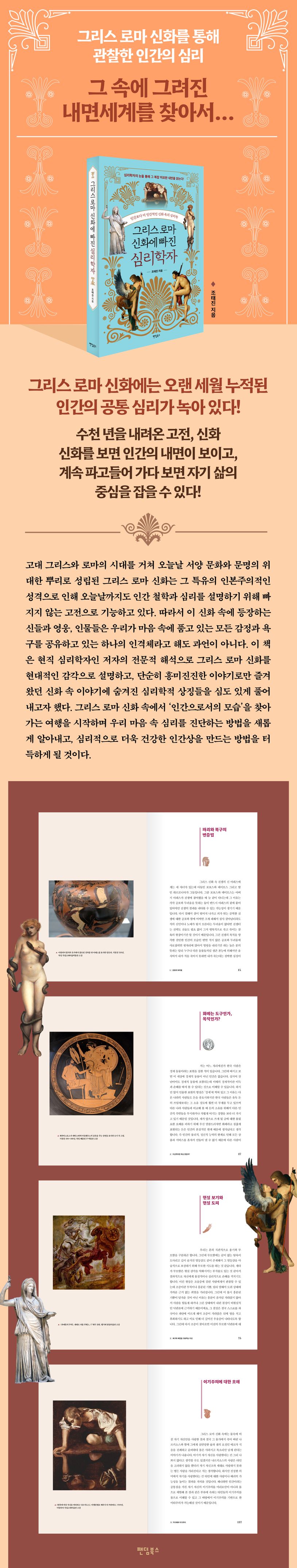 신화는 당시 고대인들의 사고방식과 사상, 철학 등이 고스란히 담긴 인생관의 집합체라고 할 수 있으며, 특히 이성적이고 합리적인 인본주의적 정신세계를 공유하고 있었던 고대 그리스인와 로마인들로부터 탄생된 그리스 로마 신화는 오늘날까지도 서양문명의 뿌리이자 심리적 원형으로 남아 인간의 보편적이고 기본적인 패턴으로 작용하고 있다. 이 책은 우리에게 익숙한 그리스 로마 신화 이야기에 숨은 심리학적 상징들을 현대적이고 정교한 심리학 기법으로 풀어냄으로써 그동안 우리 내면에 감춰졌던 다채로운 인간의 심리를 조망하고 이를 더욱 건강한 방향으로 발전시킬 방법에 대해 깊이 생각할 수 있게 해 줄 것이다.