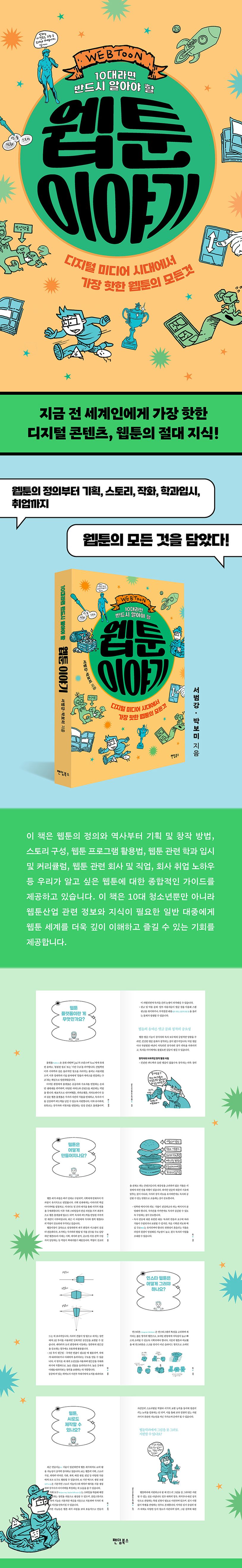 이책은웹툰의정의와역사부터기획및창작방법,스토리구성,웹툰프로그램활용법,웹툰관련학과입시및커리큘럼,웹툰관련회사및직업,회사취업노하우등우리가알고싶은웹툰에대한종합적인가이드를제공하고있습니다.이책은10대청소년뿐만아니라웹툰산업관련정보와지식이필요한일반대중에게웹툰세계를더욱깊이이해하고즐길수있는기회를제공합니다.