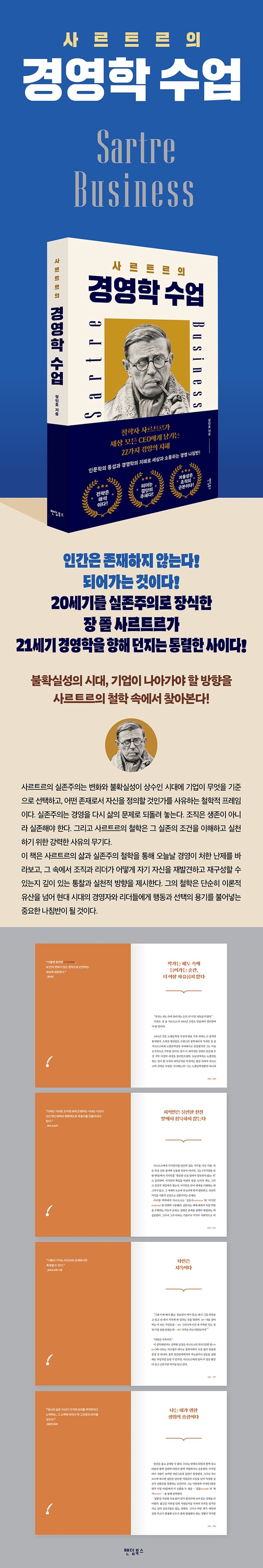 그런 점에서 이 책은 철학자 사르트르의 삶과 실존주의 철학을 통해 오늘날 경영이 처한 난제를 냉철하게 바라보고, 그 속에서 조직과 리더가 어떻게 자기 자신을 재발견하고 재구성할 수 있는지 깊이 있는 인문학적 통찰과 실천적 방향, 조직의 실존적 중요성 등을 제시한다. 사르트르의 철학은 단순히 이론적 유산을 넘어 현대 시대의 경영자와 리더들에게 행동과 선택의 용기를 지혜의 통찰을 불어넣는 중요한 나침반이 될 것이다