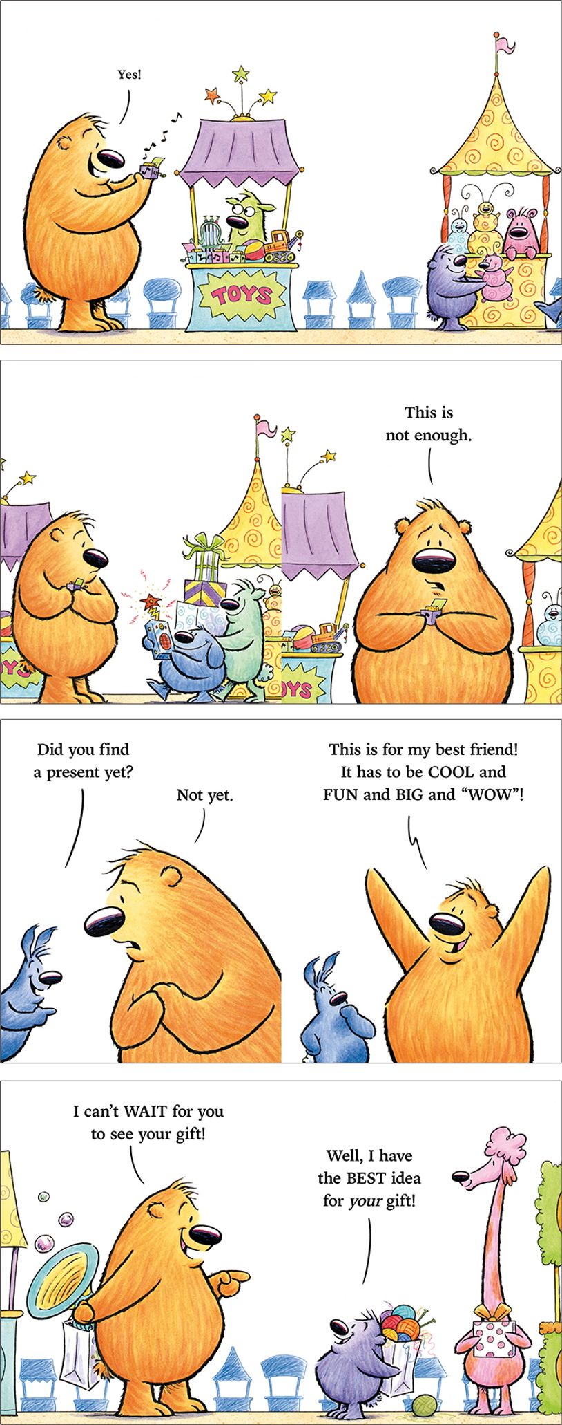 선물 주는 날이 다가왔습니다. 두 털복숭이는 서로에게 줄 선물을 고민해요. 가장 친한 친구에게 줄 선물이기에 아무거나 줄 수는 없죠. 엄청나게 멋지고, 재밌고, “우아” 하며 놀라고, 마음까지 담긴, 특별한 선물을 주고 싶어요. 선물 줄 생각에 두 털복숭이는 신이 났어요. 선물을 주는 건 이렇게 즐거운 일이죠. 선물 고르는 일이 간단할 줄 알았어요. 좋아 보이는 선물을 골랐는데, 마음에 들지 않는 점을 발견하기 전까지는요. 고르고, 고른 선물을 주려고 할 때마다 뭔가 마음에 안 들어요. 다른 선물과 비교해 보니 내가 주려는 선물이 초라해 보여요. 두 털복숭이는 계속해서 선물을 찾아다녀요. 과연 두 털복숭이는 친구에게 가장 특별한 선물을 줄 수 있을까요?